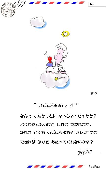 ふわふわ天使225通め ・・きょうは たいへん びっくりくりっくりしました。 「もしも~し それは もっていかないでよねえ!くびかざりじゃないし こどもには にあわないよ!ぼくみたいに おとなにならないとねえ~ってば!」(ファアファアは もう おとなのつもりなんだね。)