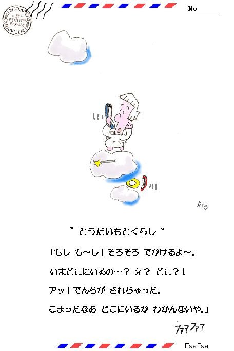 ふわふわ天使233通め ・・「もし も~し!そろそろ でかけるよ~。 いまどこにいるの~? え? どこ?!アッ!でんちが きれちゃった。こまったなあ どこにいるか わかんないや。」
